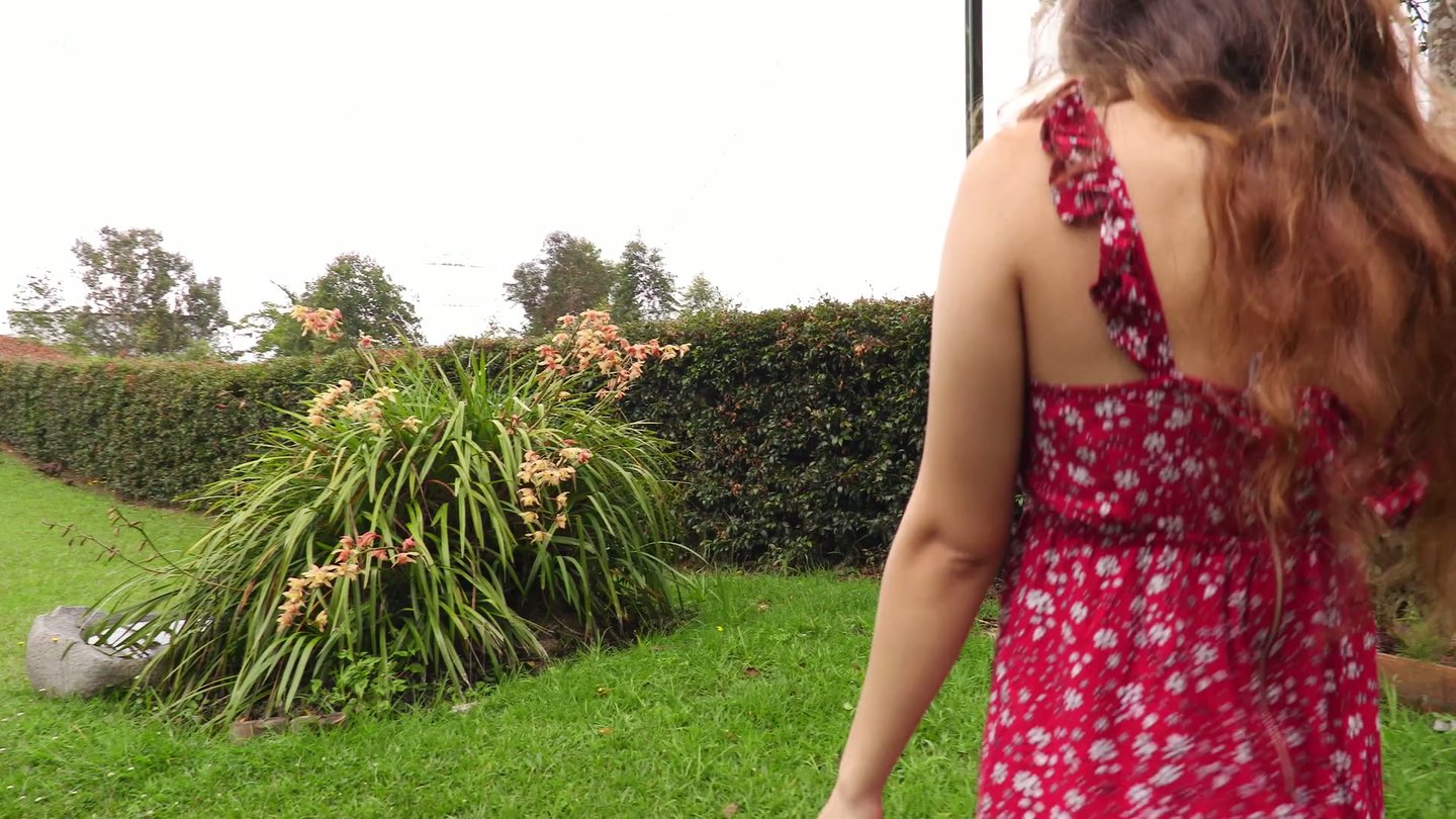 Watch Outdoors fun with horny Irene Rouse in sexy red summer dress